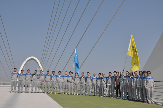 沿著青奧會議中心腳下的坡道順行而上,一座壯觀的大橋蹦到了眼前,它就是我們的目的地——“南京眼”。羽翼般斜拉的鋼索振翅向上就像豎琴的琴弦,穿行其間猶如琴弦上跳躍的音符。潤邦精神也如同這鋼索,堅韌不拔,奮力向上,展翅高飛。